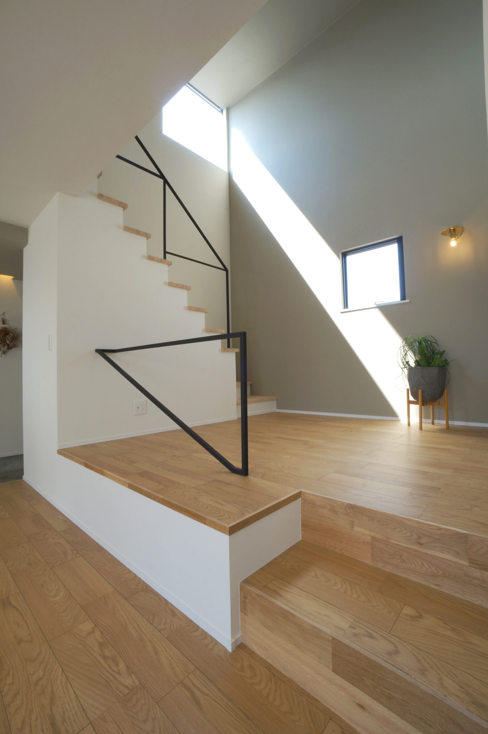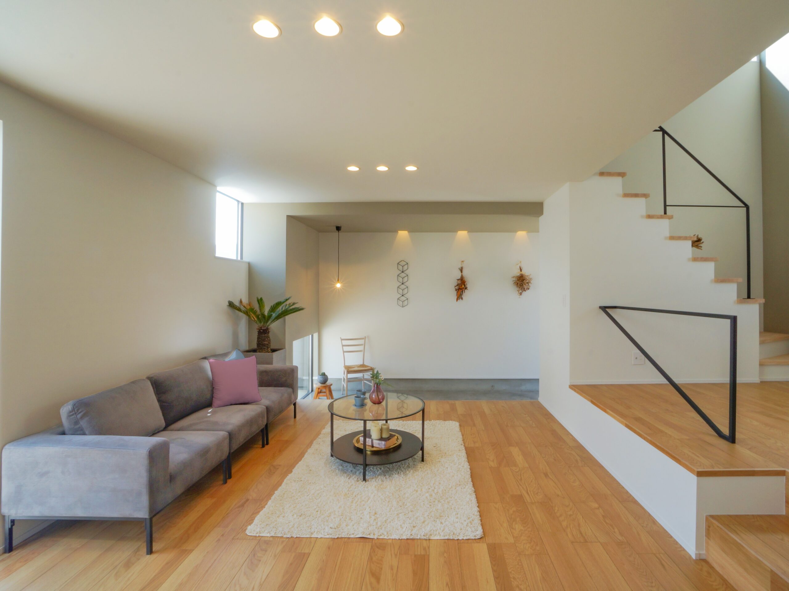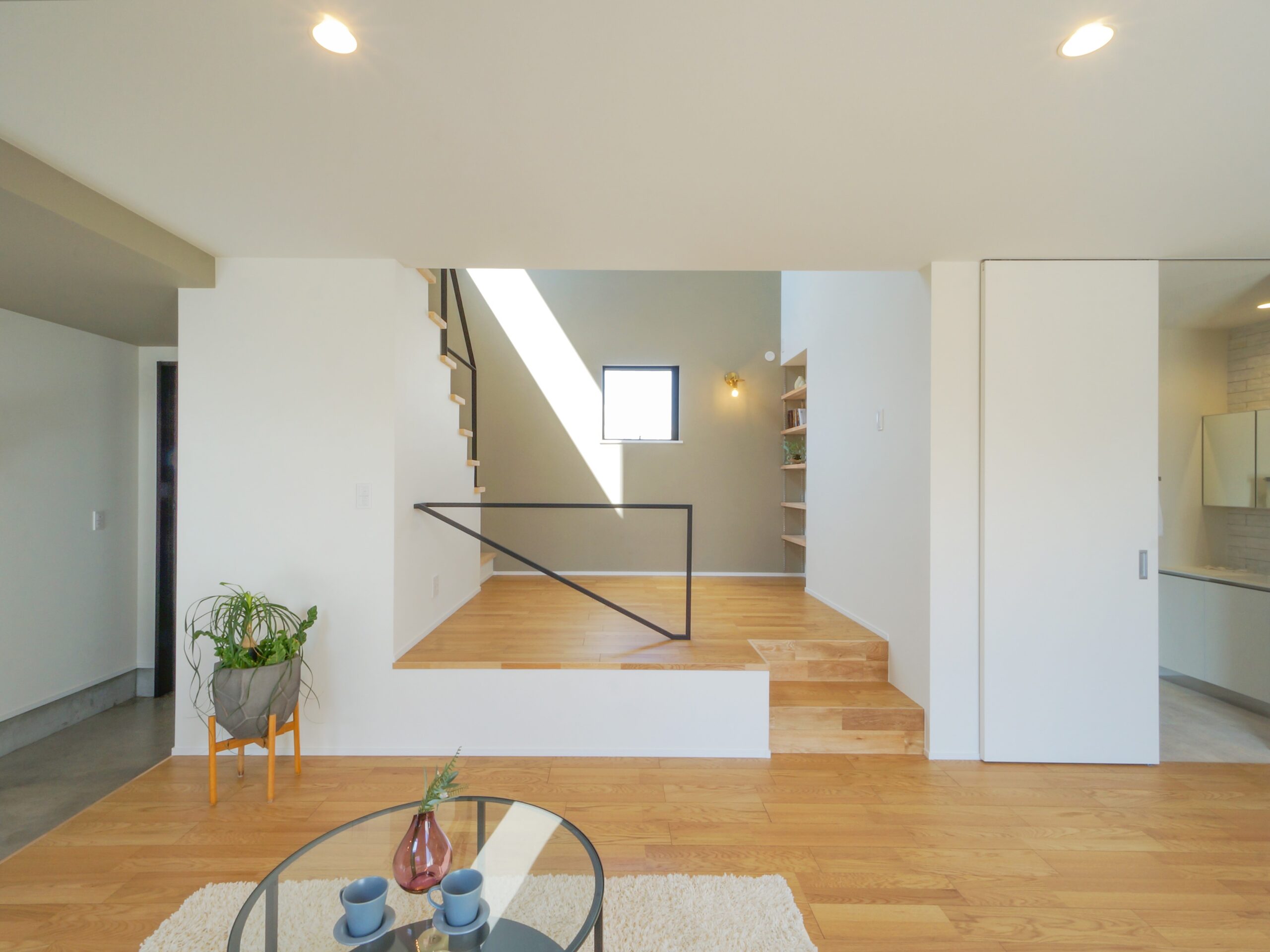 土間玄関から廊下レス設計で繋がる広々リビング。さらにスキップフロアで空間の広がりを意識しています。