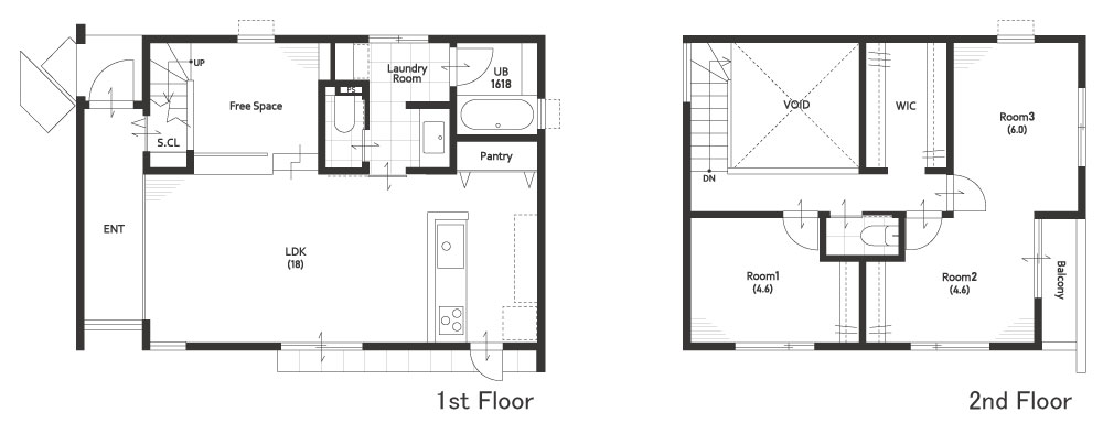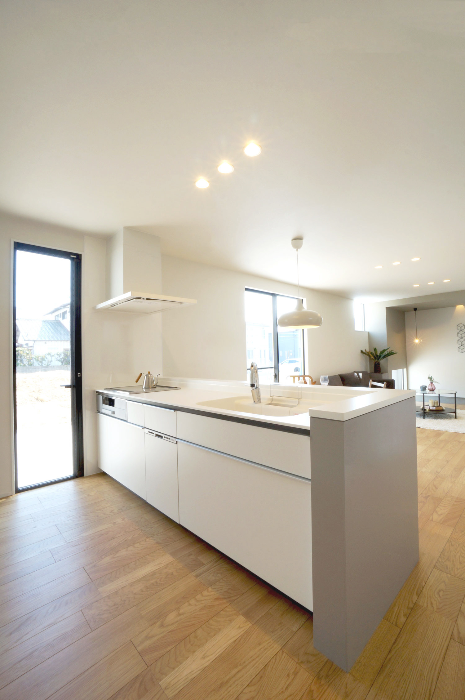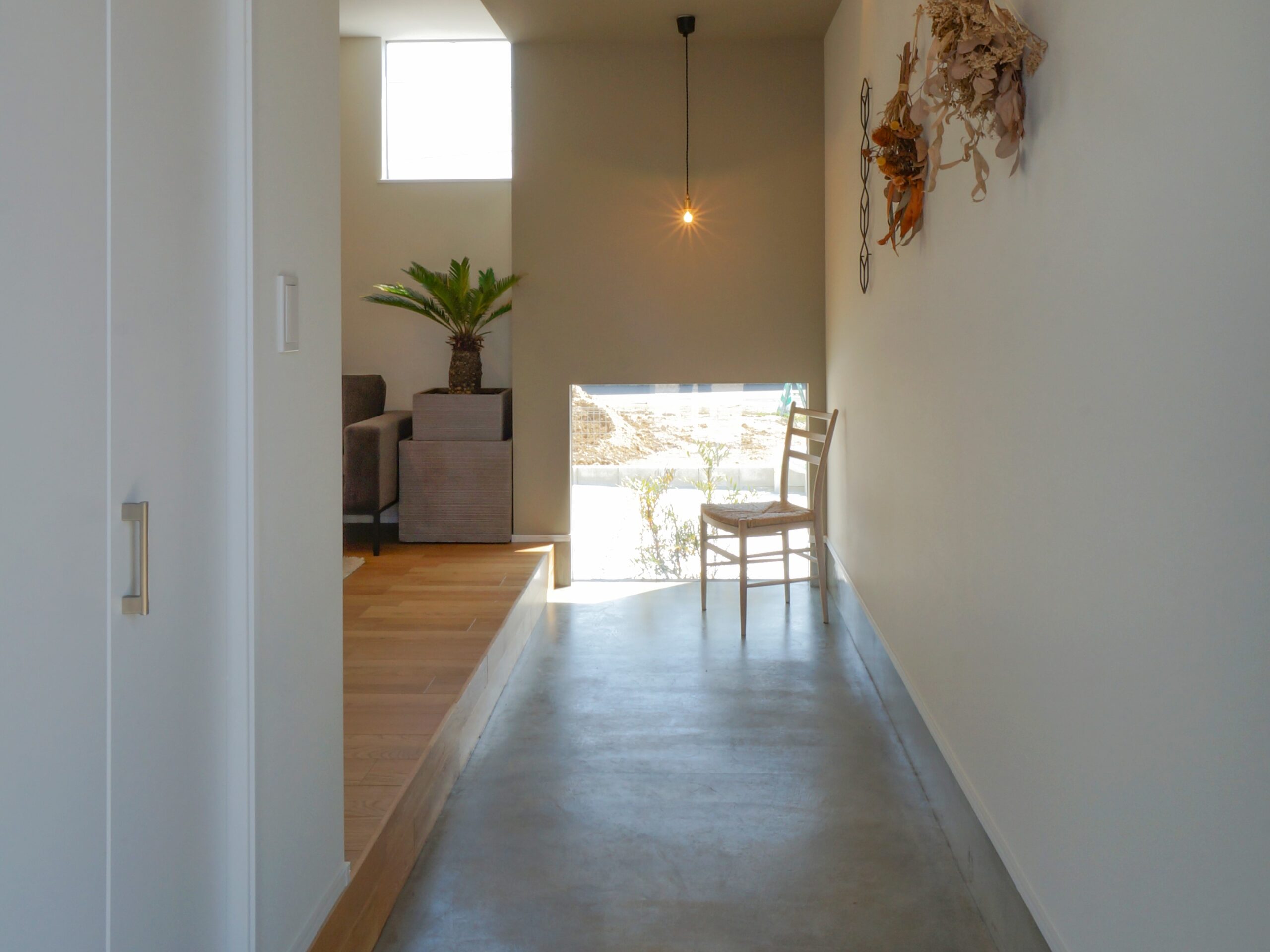 土間玄関から廊下レス設計で繋がる広々リビング。さらにスキップフロアで空間の広がりを意識しています。